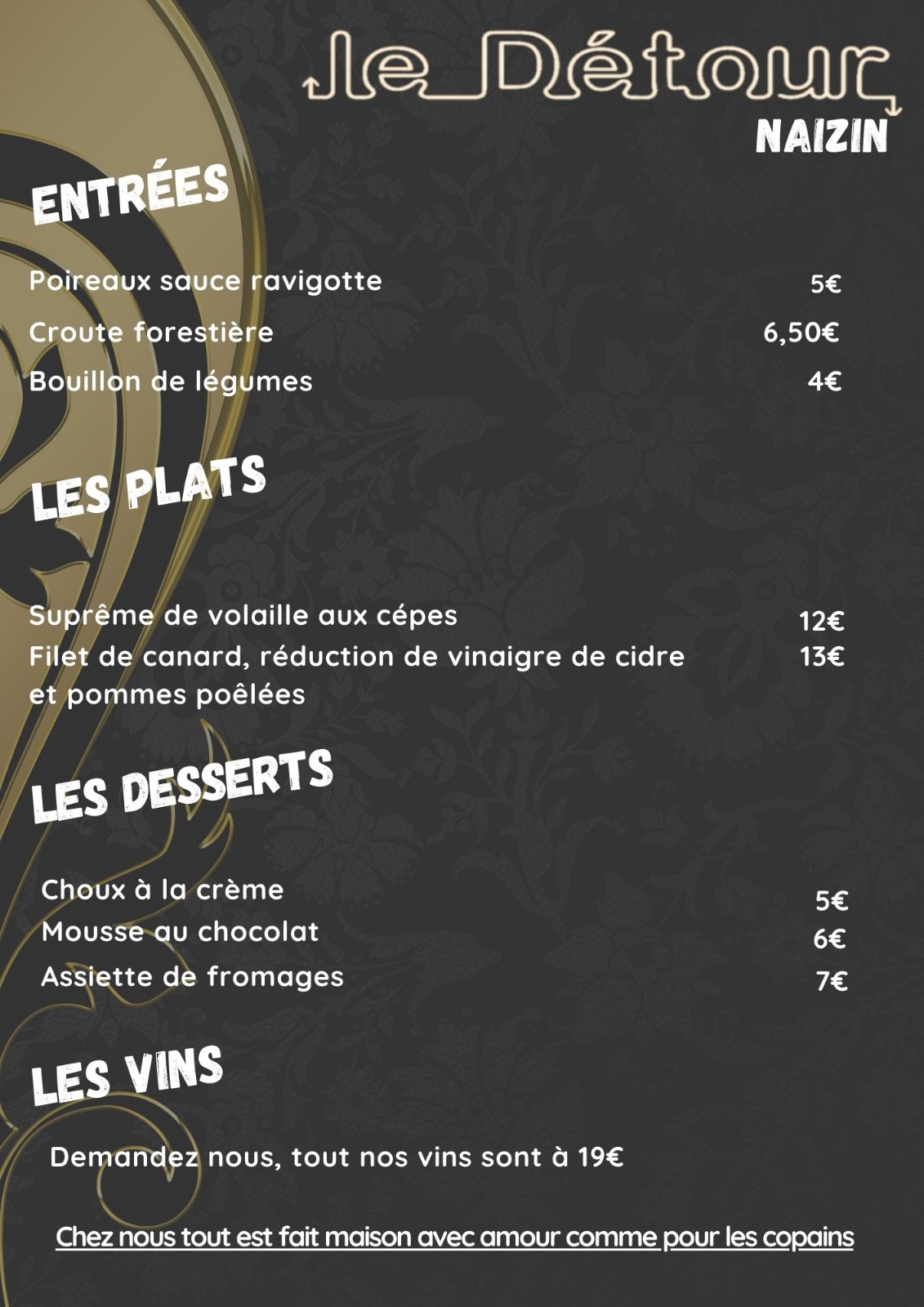 Nous vous proposons une formule à partir de 14€ où tout est fait maison, de l'entrée au dessert. Découvrez ici nos propositions de prestations